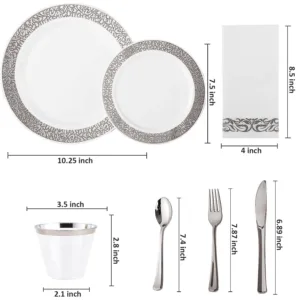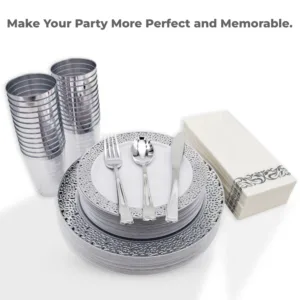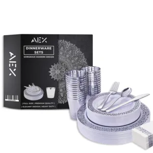 Make your next celebration hassle-free and stylish with the AEX 175-Piece Disposable Dinnerware Set for 25 People. Featuring everything you need for a beautiful table setting, this set combines the look and feel of traditional dinnerware with the convenience of disposables. Whether you’re hosting a wedding, family gathering, or holiday event, this set will elevate your dining experience and make cleanup a breeze.